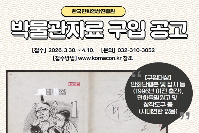 문화체육관광부(장관 최휘영)와 한국만화영상진흥원(원장 백종훈, 이하 진흥원)은 우리 만화 문화의 역사적·문화적 가치를 지닌 만화자료를 수집·보전하여 후...