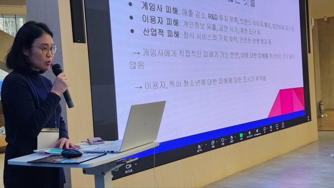 한국게임미디어협회와 한국게임정책자율기구가 4일 개최한 ‘게임 불법 사설 서버 피해와 대책’을 주재로 한 세미나에서 서울시립대학교의 손혜림 교수가 불법 ...