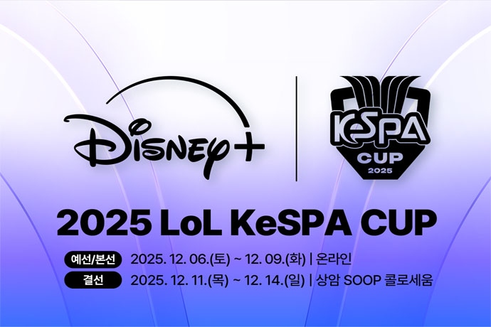 한국e스포츠협회(이하 협회)는 디즈니+가 단독 중계하는 국내 유일의 리그 오브 레전드(이하 LoL) 단기 컵대회 ‘2025 LoL KeSPA CUP’이 오는 12월 6일(토) 개...