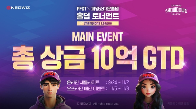 네오위즈(공동대표 김승철, 배태근)는 온라인 포커 게임 ‘피망 쇼다운 홀덤’이 ‘PFGT X 피망 쇼다운 홀덤 토너먼트 챔피언스 리그’ 온라인 새틀라이트를 개...
