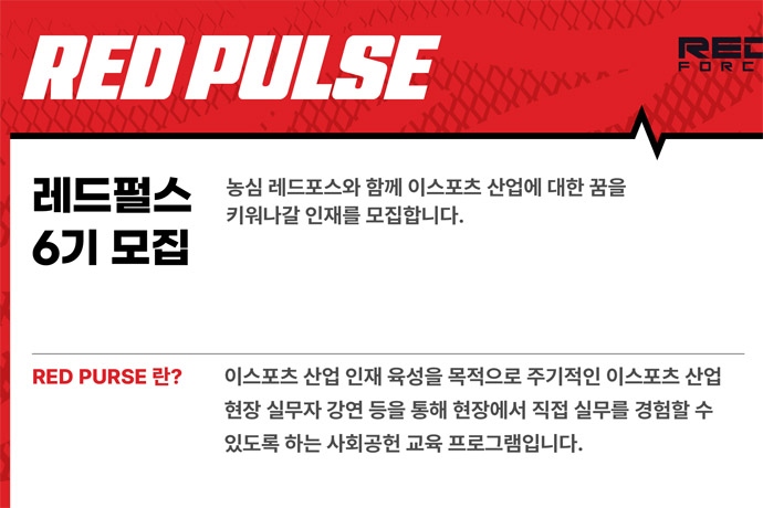 프로 이스포츠 구단 농심 레드포스가 ‘레드펄스(RED PULSE)’ 6기를 모집한다. ‘레드펄스’는 농심 레드포스가 주도하는 이스포츠 인재 양성 프로젝트로, 현장...