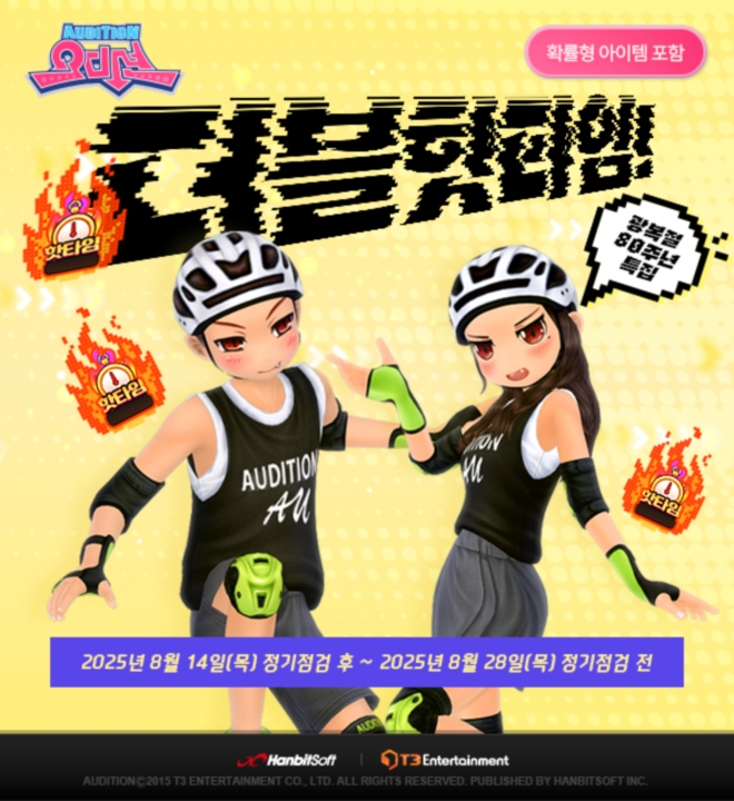 한빛소프트가 광복절을 기념해 자사에서 서비스하는 PC 온라인 스타일리시 리듬댄스 게임 ‘오디션’에서 ‘더블 핫타임’ 이벤트를 8월 14일 정기점검 후부터 8...