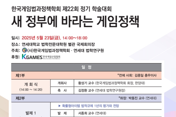 한국게임법과정책학회(회장 황성기, 한양대학교 교수)가 2025년 5월 23일(금) 오후 2시부터 연세대학교 법학전문대학원 별관 국제회의장에서 '새 정부에 바라는 ...