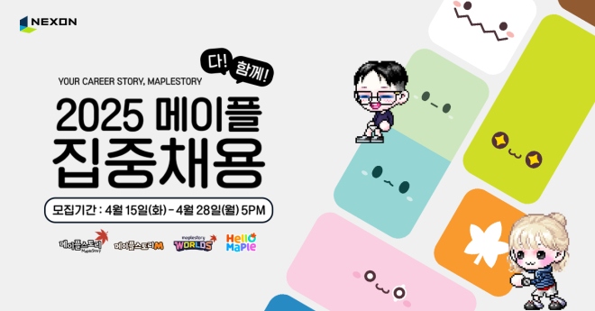 넥슨(공동 대표 강대현∙김정욱)은 4월 15일부터 28일까지 ‘2025 메이플 다 함께 집중채용’을 진행한다. 지난해에 이어 넥슨은 ‘메이플스토리’, ‘메이플스...