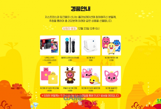 해당 이벤트는 12월 1일(일)부터 12월 23일(월) 정오까지 온라인을 통해 참여할 수 있으며 당첨유무는 12월 23일 오후 6시에 인트라게임즈 홈페이지 및 블로그, 해당 웹사이트를 통해 확인할 수 있으며 당첨자에 한 해 각 SNS의 DM 또는 이메일을 통해 개별 통보 예정이다. 인트라게임즈는 추첨을 통해 총 202명에게 닌텐도 스위치 + 저스트 댄스 2020, 플레이스테이션4 무브봉, 핑크퐁 캐릭터 상품 등 풍성한 선물을 제공할 예정이다.