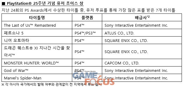 PS Awards는 1994년 PlayStation이 출시된 이후 매년 개최되었으며, 올해로 PlayStation과 PS Awards 모두 25주년을 맞이했다. 올 한 해 동안 창작자들이 쏟은 노력과 그들의 작품을 기리기 위해 진행되는 이번 PS Awards에서는 총 35개의 타이틀이 다음과 같이 40개의 상을 수상했다.
