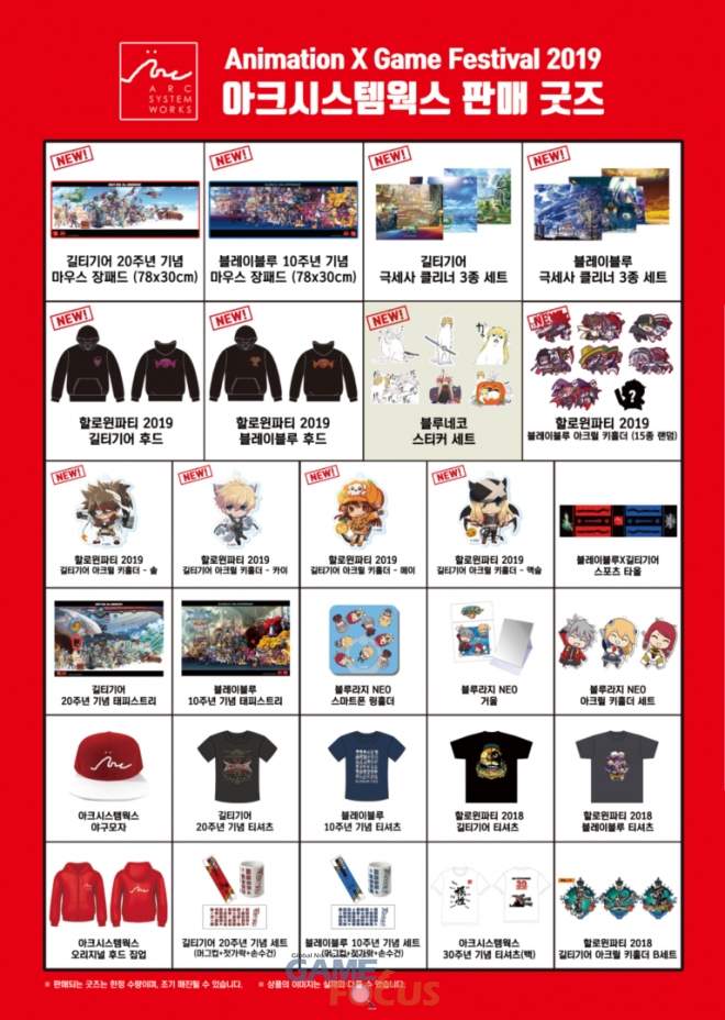 아울러 시연 부스 옆에서 판매할 굿즈의 라인업도 공개했다. 최근 일본에서 공개된 굿즈는 물론, 한국 오리지널 굿즈인 길티기어 및 블레이블루 마우스 장패드와 극세사 클리너 등도 판매되며, 기존 굿즈의 경우 할인 프로모션도 진행된다.