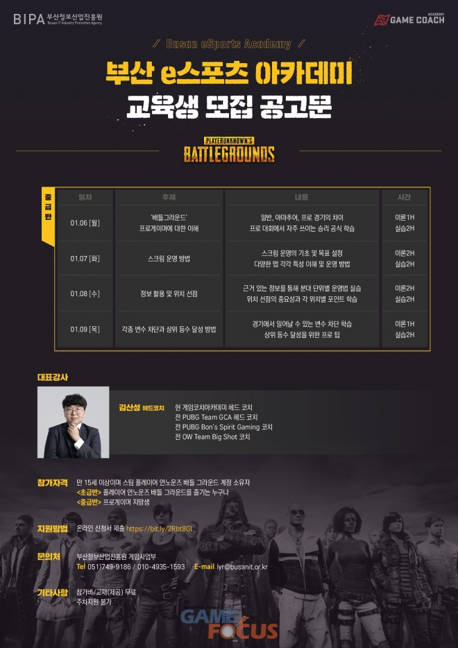 e스포츠 교육기관 게임코치아카데미(이하 '게임코치')는 16일, 부산정보산업진흥원에서 운영하는 ‘2019 부산 e스포츠 아카데미의 4회차 배틀그라운드’ 과정을 담당하게 된다고 밝혔다.