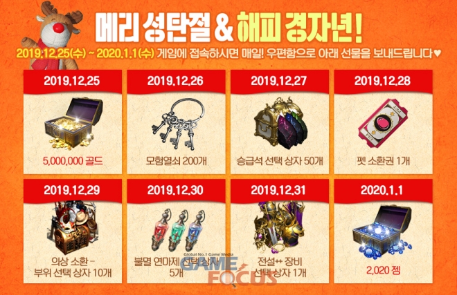 먼저 '다크어벤저 3'에서는 12월 25일부터 1월 1일까지 크리스마스와 새해를 기념한 '메리 성탄절 & 해피 경자년' 이벤트를 진행한다. 이용자는 이벤트 기간에 게임에 접속하여 '2,020젬', '500만 골드', '펫 소환권' 등 다양한 아이템을 얻을 수 있다.