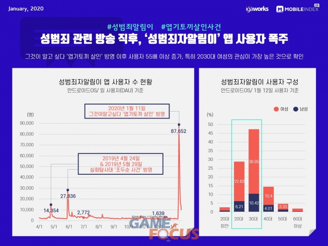 또한 그것이 알고 싶다 '엽기토끼 살인' 방영 다음날인 2020년 1월 12일 기준 사용자 구성은 2030대 여성 사용자 수 비율이 59.58%로 압도적으로 높았다.