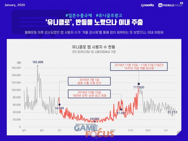 2019년 7월 시작된 일본 불매운동 이후 감소되었던 앱 사용자 수가 2019년 11월 15일부터 21일까지 7일간 진행된 '15주년 기념 겨울 감사제'를 통해 점차 회복하는 듯 보였으나, 이내 다시 하향세로 접어들었다.