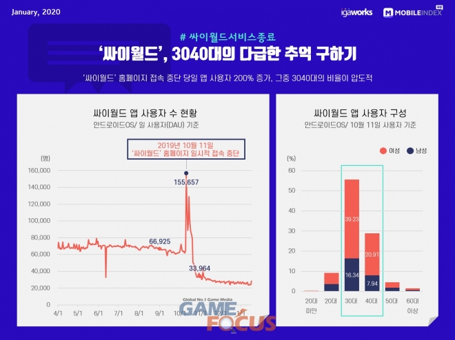 2019년 10월 11일, '싸이월드' 홈페이지 접속 중단 당일, 서비스 종료에 대한 불안감이 불거지면서 앱 사용자가 평일 대비 약 2.5배 증가한 것으로 나타났다.