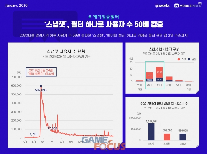 2019년 5월 24일, 2030대를 열광시킨 스냅챗의 '베이비필터' 이슈화로, 하루 사용자 수 59만명을 돌파했다.