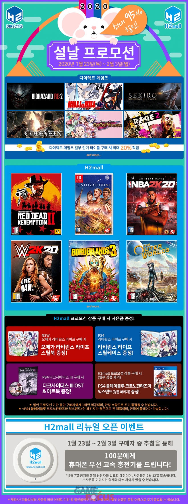 다이렉트 게임즈에서는 일부 인기 타이틀 구매 시 적립금이 최대 20% 추가되는 이벤트가 함께 진행되며, H2몰에서는 PS4 & 스위치 오메가 라비린스 라이프 구매시 스틸케이스, PS4 다크사이더스 III 구매시 다크사이더스 III OST & 아트북을 제공하는 이벤트, 그리고 일부 프로모션 상품 구매 시 PS4용 타이틀 ‘블레이블루 크로노 판타즈마 익스텐드' 패키지를 증정하는 이벤트와 함께 리뉴얼 오픈을 기념해 휴대폰 무선 고속 충전기를 100명에게 추첨을 통해 제공하는 이벤트도 동시에 진행된다.