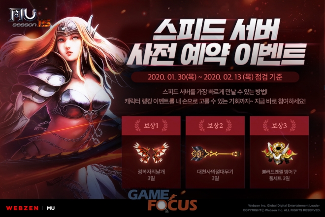 웹젠은 2월 6일(목)에 '2020년 스피드 서버'를 새롭게 오픈한다. '스피드 서버'는 캐릭터 경험치 3배 이상, 아이템 획득 확률을 10배로 상향 조정해 최대 700레벨까지 빠르게 캐릭터 레벨을 올릴 수 있는 특수 서버다.
