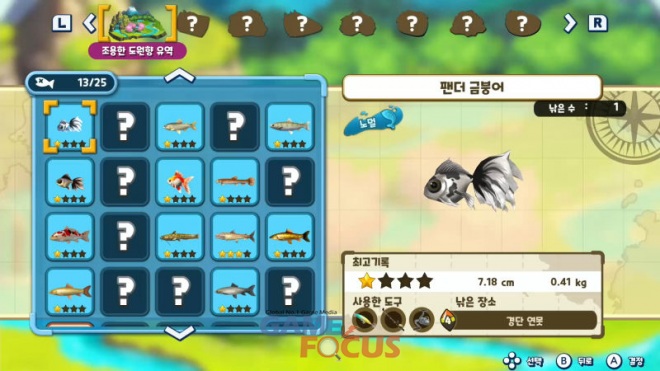 잡은 어종은 도감에 기록되며, 자신이 낚은 모든 어종의 종류와 크기, 무게를 확인할 수 있다. 어종의 크기와 무게에 따라 4단계로 나뉘어 등급이 표시되므로, 플레이어는 더욱 높은 등급의 어종을 낚으며 도감을 완성해 나가게 된다.