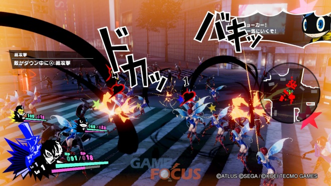 본편과 마찬가지로 '페르소나 5 스크램블'의 공격은 기본 공격과 총격, 그리고 '페르소나' 공격으로 구성되어 있다. 적들이 화면을 가득 채우는 무쌍 액션 게임 특유의 시스템에 약점 속성을 공략하면 전체 공격을 사용할 수 있어 시원한 액션 연출이 펼쳐진다. 조작 역시 크게 어렵지 않아 무쌍 액션을 처음 접해보는 사람도 무리 없이 플레이할 수 있을 정도.