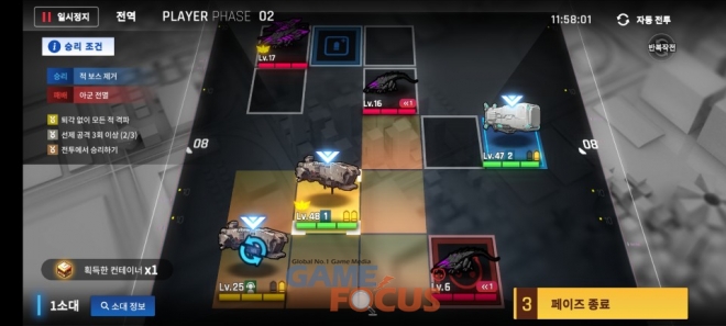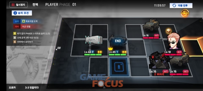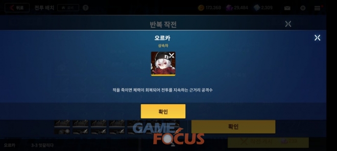 반복 전투 기능을 이용하면 스테이지 공략에 실패하거나 창고가 전부 차기 전까지 플레이어가 임의로 지정한 횟수만큼 스테이지에 반복해서 도전한다. 3-3 스테이지를 돌면서 어느정도 레벨이 올랐다면 편성한 부대에서 인원을 한 명씩 제외하는 것을 추천. 제대 내 인원을 꽉 채워 편성하는 것보다는 인원의 수를 줄이면 출격 자원을 절약할 수 있으며 하나의 유닛이 얻는 경험치의 양도 늘어난다.