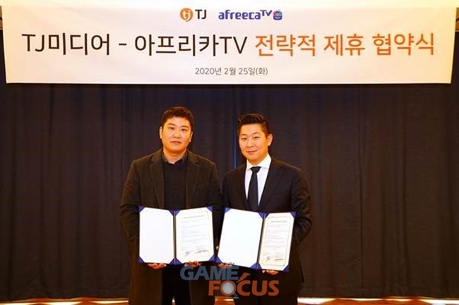 아프리카TV는 25일 TJ미디어와 A1 반주기에 아프리카TV 라이브 방송 서비스를 도입하기 위한 전략적 제휴 협약식을 진행했다. 서울 등촌동 TJ미디어 본사 대회의실에서 진행된 이번 협약식에는 아프리카TV 이민원 콘텐츠전략사업본부장과 TJ미디어 윤나라 부사장이 참석했다.