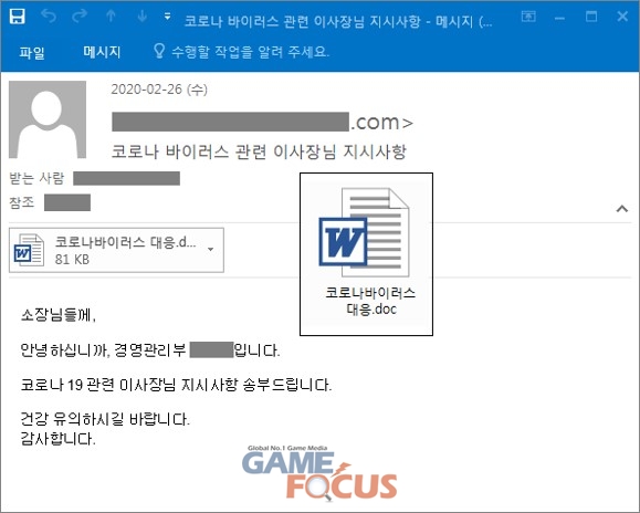 악성 이메일은 유창한 한글로 내용이 작성되었으며, 수신자가 의심 없이 메일을 열어 보도록 최근 코로나19 감염 피해 예방을 위해 각종 공지 사항이 많이 전달되고 있는 상황을 노린 것으로 보인다.