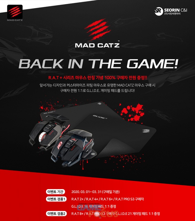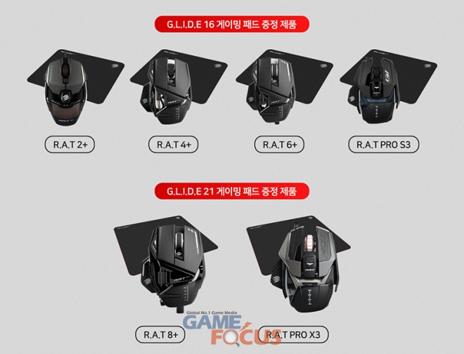 이번 이벤트는 매드캣츠의 간판 제품은 R.A.T 플러스(PLUS) 게이밍 마우스 시리즈 구매자들에게 동사의 게이밍 마우스 패드 제품인 G.L.I.D.E 시리즈를 차등 지급한다. R.A.T 2 플러스, 4 플러스, 6 플러스, 프로(PRO) S3 시리즈 4종은 G.L.I.D.E 16 모델을, R.A.T 8 플러스와 프로 X3 2종은 G.L.I.D.E 21 모델을 함께 받을 수 있다.