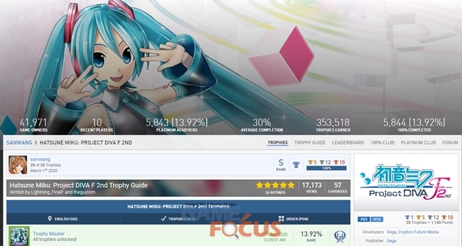 최근 하츠네미쿠 신작이 스위치로 출시되어 다시 하츠네미쿠 게임을 컴플릿해야겠다는 의욕이 강해져 이번에야말로 끝내자는 각오로 진행해 마침내 3월 1일, '하츠네미쿠 프로젝트 디바 F2' 플래티넘 트로피를 획득했다. 마지막 트로피는 아마도 대부분 유저가 마지막으로 획득하게 될 '장식품 모두 수집하기' 트로피였다.