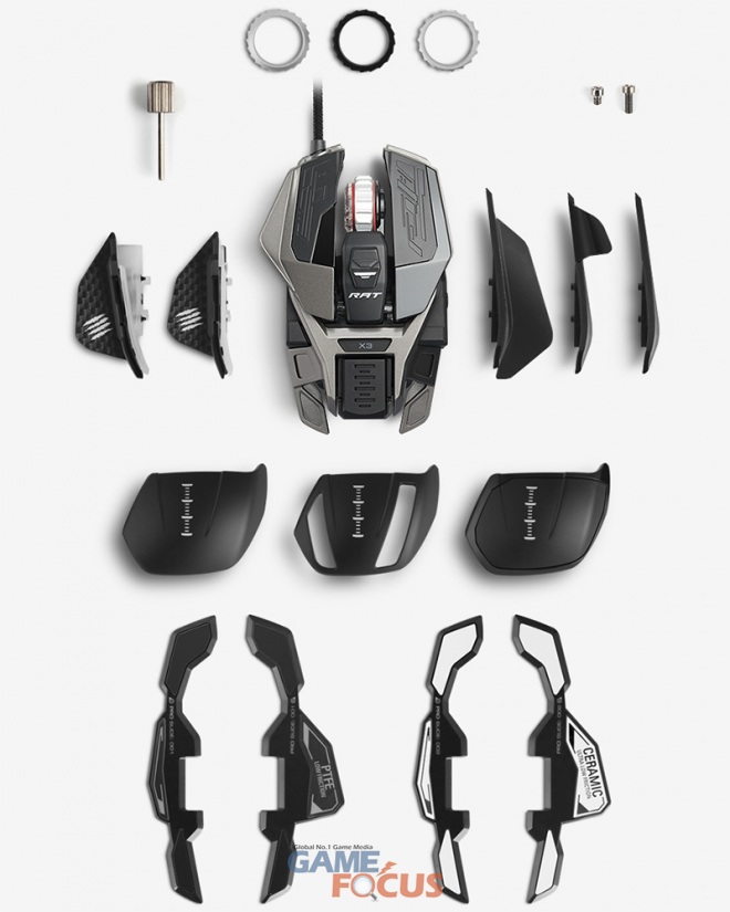 매드캣츠 R.A.T 프로 X3 는 기존 R.A.T 시리즈와 비슷해 보이는 외형을 갖고 있지만, 교체 사용이 가능한 더 많은 부품들을 가지고 있으며, 최첨단 소재로 만들어졌다. 먼저 검지와 중지 외에 마우스에서 가장 많은 힘을 받는 위치인 엄지 손가락 받침대는 카본 소재로 이루어졌다.
