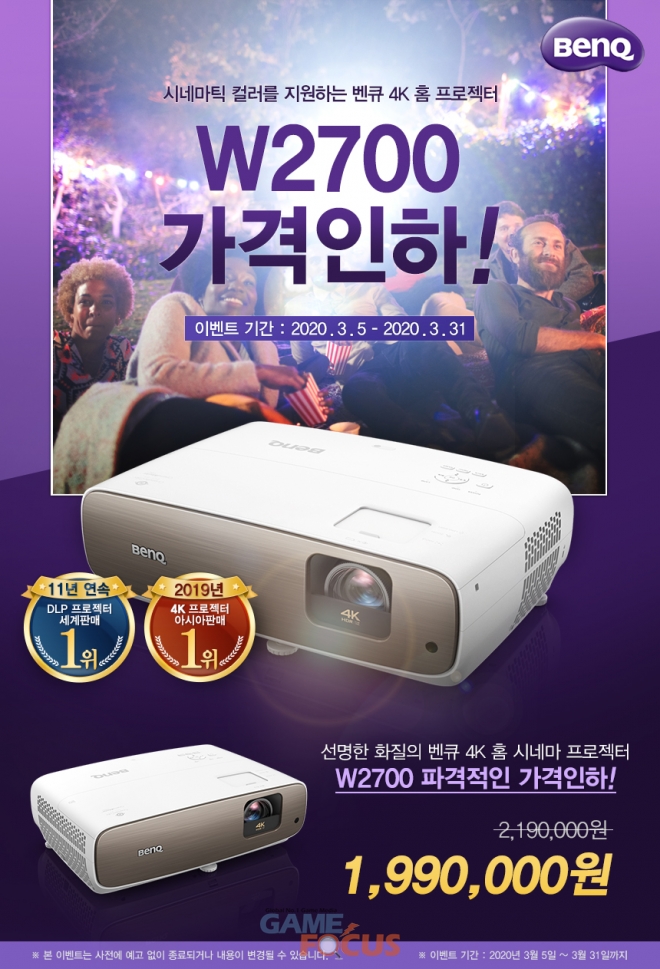 프리미엄 홈시네마 4K UHD(3840x2160) 프로젝터 W2700의 경우 정상가 대비 20만원 할인된 가격인 199만원에 구매가 가능하다. 듀얼 RGB 컬러휠과 독자적인 시네마틱 컬러 기술을 바탕으로 정확한 컬러를 구현하는 W2700 프로젝터는 영화 산업의 색 표준 규격인 DCI-P3를 95%, Rec.709를 100% 지원한다. HDR10, HLG를 지원할 뿐 아니라 강화된 톤 매핑 기술과 HDR 밝기 최적화 기술이 적용된 HDR-PRO기술이 적용되어 다양한 환경에서도 영상의 밝기와 색상을 실제와 같은 수준으로 균일하게 재현한다. 자동 수직 키스톤과 1.3배의 줌을 지원하여 비교적 작은 공간에서도 설치가 용이하며, 주거 공간인 거실을 가족을 위한 영화관으로 탈바꿈시킬 수 있다. 또, 색 왜곡의 표준 편차인 델타 E(Delta E) 값을 3.0 이하로 낮춰 보다 정확한 색상을 표현하며, 팩토리 캘리브레이션 리포트가 제공된다.