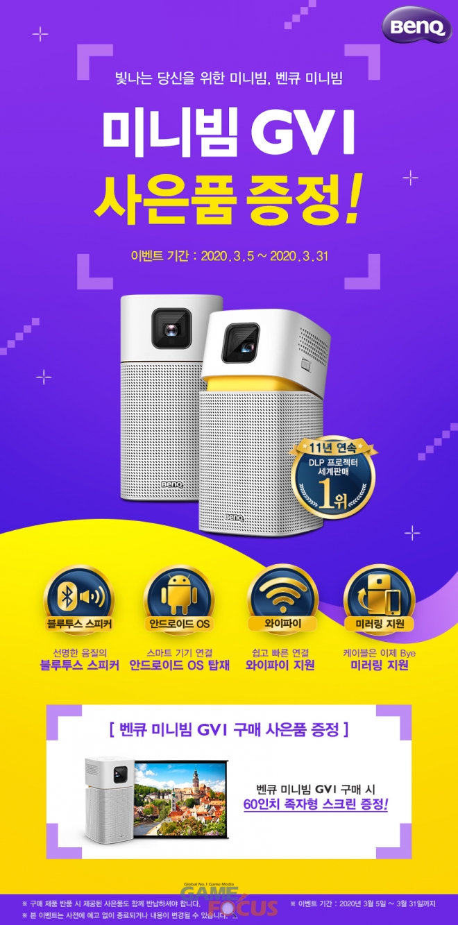 휴대가 용이한 포터블 미니빔프로젝터 GV1구매자에게는 실내 혹은 캠핑장에서 함께 사용할 수 있는 60인치 족자 스크린을 증정한다. GV1은 안드로이드 OS와 내장스토리가 탑재되어 있어, 스트리밍 앱을 다운로드해 간편하게 영상을 감상할 수 있다. 가로, 세로 80mm, 높이 155mm의 크기이며, 무게도 약 700g수준으로 가벼워 한 손에 쏙 들어온다. 듀얼밴드(2.4GHz/5GHz) Wi-Fi와 블루투스 4.0을 지원하며, 무선 인터넷 환경이 아닌 곳에서는 모바일 핫스팟 기능을 이용해 스트리밍 영상을 감상할 수 있다. 또한, USB Type-C 단자를 지원해 C타입의 USB 메모리를 직접 연결하거나, 스마트폰 혹은 노트북과 연결하여 영상 전송이 가능하다. 5W 챔버 스피커를 탑재하여 블루투스 스피커로 사용하는 경우에도 훌륭한 성능을 보여준다.