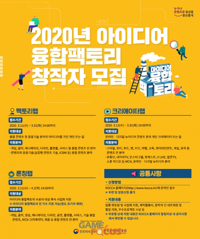 문화체육관광부(장관 박양우)와 한국콘텐츠진흥원(원장 김영준, 이하 콘진원)이 창작자들의 아이디어를 지원하여, 창작을 통한 창업으로 이어지게 이끄는 '2020 아이디어 융합팩토리' 프로그램에 참여할 창작자를 모집한다.
