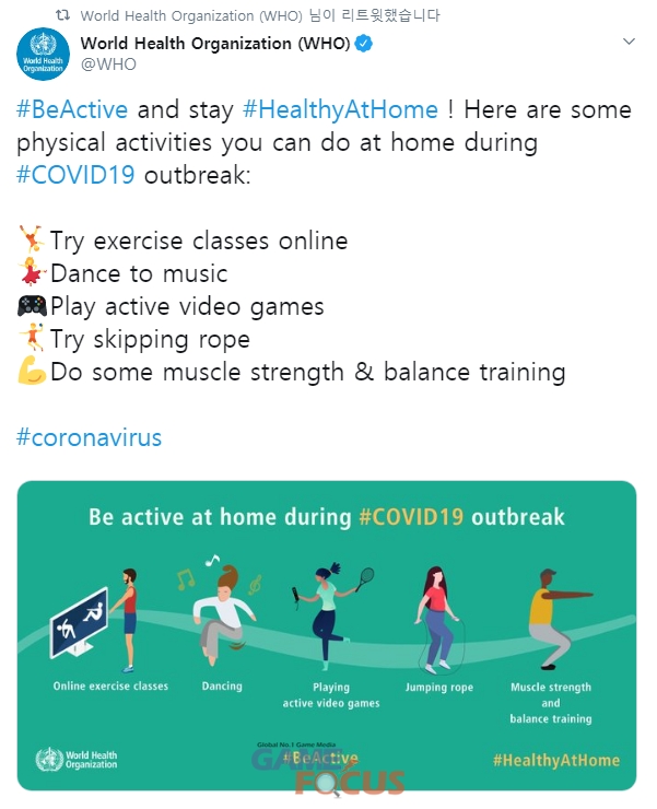 국제 보건기구(WHO)의 테드로스 아드하놈 게브레예수스가 최근 자신의 SNS를 통해 집에서 할 수 있는 여가 생활로 '게임'을 언급한 가운데 이번엔 WHO가 직접 코로나19 사태에서 건강을 지키기 위해 집에서 할 수 있는 주요 활동으로 다시 한 번 게임을 언급해 관심을 모은다.