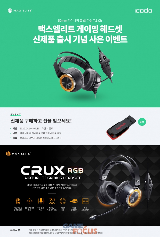 아이코다는 4월 10일부터 30일까지 모든 맥스엘리트 CRUX RGB HS-170 게이밍 헤드셋 구매자에게 샌디스크 크로저 Blade Z50 16GB를 1:1로 증정하는 이벤트를 진행한다. 별도의 이벤트 신청 없이 제품구매시 함께 배송된다.