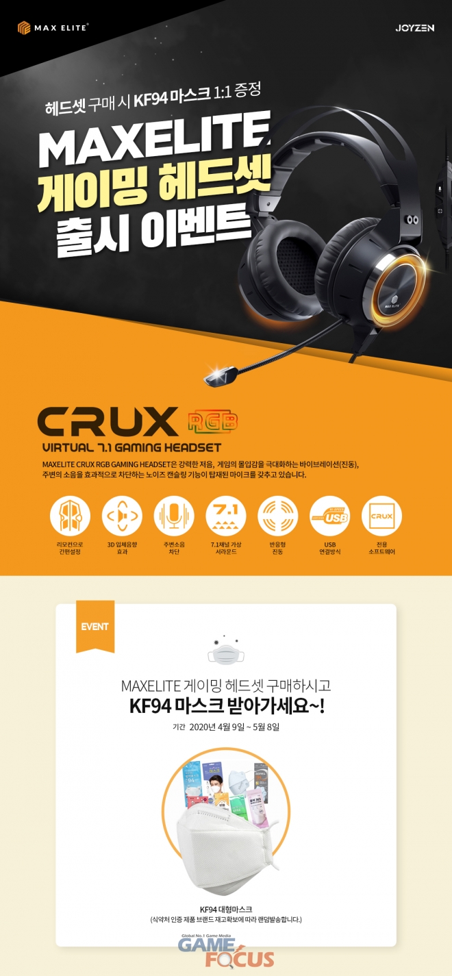 조이젠은 4월 9일부터 5월 8일까지 맥스엘리트 CRUX RGB HS-170 게이밍 헤드셋 구매자에게 1:1로 KF94 마스크를 증정하는 이벤트를 진행중이다. (식약처 인증 제품 브랜드 재고확보에 따라 랜덤 발송) 마찬가지로 별도의 신청없이 제품구매시 같이 배송된다.