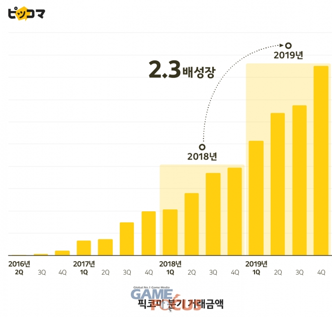 2016년 4월 론칭한 픽코마는 다음해인 2017년 연간 거래액이 14배로 늘어났고, 2018년 156% , 2019년은 130%(2.3배) 증가하여 매년 2배 이상의 성장세를 보여주고 있다.