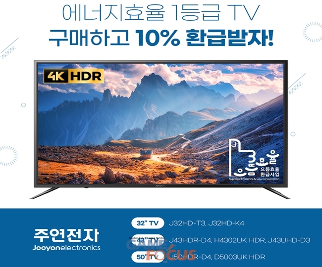 으뜸효율 가전제품 구매비용 환급을 받을 수 있는 주연전자의 에너지소비효율 1등급 제품은 32형 J32HD-T3, J32HD-K4 모델 2종과 43형 J43HDR-D4, H4302UK HDR, J43UHD-D3 모델 3종 그리고 50형 J50HDR-D4, D5003UK HDR 모델 등 총 7종이다.