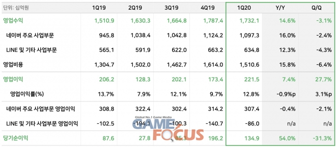 네이버(대표이사 사장 한성숙)가 2020년 1분기 매출 1조 7,321억 원, 영업이익 2,215억 원, 당기순이익 1,349억 원을 각각 기록했다고 밝혔다.