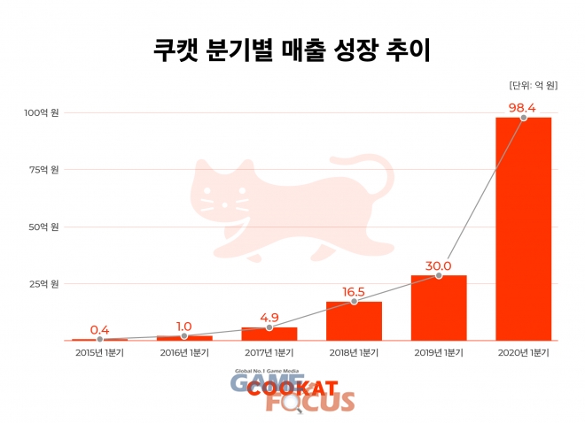 2014년 하반기 쿠캣 설립 이후 첫 1분기 실적이 발생한 2015년 1분기 대비해서는 무려 281배나 성장한 수치다. 쿠캣의 지난 5년간 1분기 매출액은 2019년 30억 200만 원, 2018년 16억 5000만 원, 2017년 4억 8600만 원. 2016년 1억 100만 원, 2015년 3500만 원이다. 연 매출액은 2019년 185억 원, 2018년 79억 원, 2017년 43억 원, 2016년 10억 6000만 원, 2015년 2억 7000만 원이다. 쿠캣의 최근 1년간 월 평균 성장률은 약 15%다. 매월 두 자릿수 성장률을 기록 중인 셈이다.