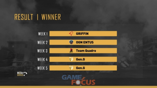 BWS 페이즈 1에서는 ▲GRIFFIN ▲OGN ENTUS ▲Team Quadro ▲Gen.G(연승)가 순서대로 우승의 영예를 차지했다. 특히, 4·5주 차 경기 연속 우승을 거머쥔 Gen.G는 총 400만 원의 상금을 획득했고, 매치당 평균 최다 킬 기록인 5.16킬을 획득했다.