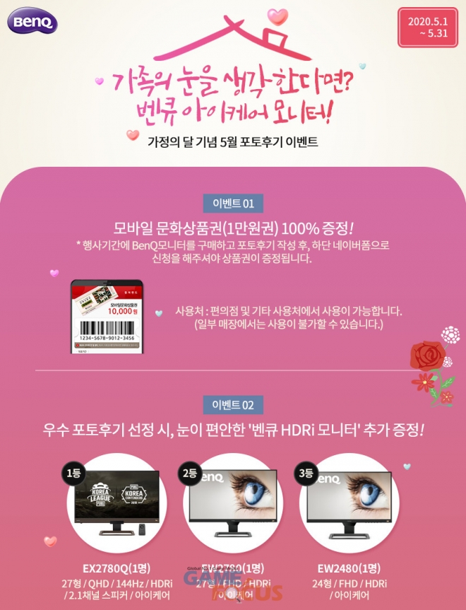 가정의 달을 맞아 진행하는 5월 포토후기 이벤트는 벤큐 모니터를 구입하고 사진을 포함한 구매 후기를 작성한 모든 고객에게 모바일 문화상품권 (1만원권)을 100% 증정하며, 포토후기 우수리뷰로 선정된 3명에게는 시력보호 기능이 강화되어 눈이 편안하면서도 HDR로 실감나는 영상을 즐길 수 있는 '벤큐 HDRi 모니터' (EX2780Q, EW2780, EW2480)를 각 1대씩 추가로 증정한다.