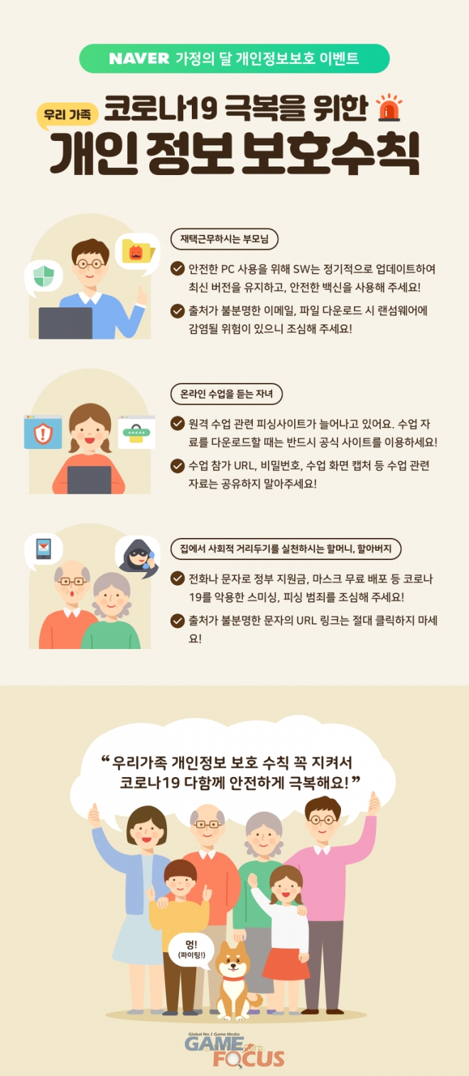 네이버(대표이사 한성숙)는 가정의 달을 맞아, 온 가족이 생활 속에서 안전하게 개인정보를 보호할 수 있도록 보호수칙을 알리는 '개인정보보호 이벤트'를 진행하고 있다.