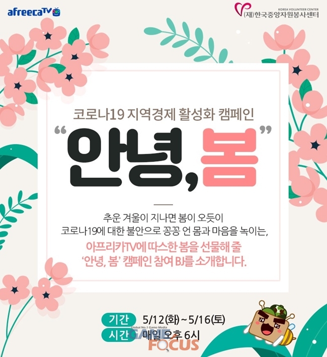 아프리카TV는 한국중앙자원봉사센터와 함께 코로나19로 침체된 지역경제를 되살리기 위해 '안녕, 봄' 캠페인을 진행한다.