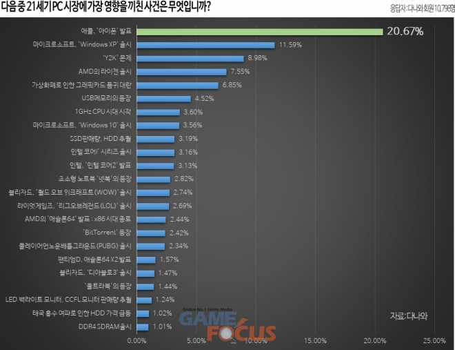 21세기 PC시장에 가장 큰 영향을 끼친 사건으로는 애플 '아이폰' 발표가 전체 중 20.7%로 가장 많은 득표율을 차지했다. 2위는 마이크로소프트 '윈도우XP' 출시(11.59%)가 차지했으며, 'Y2K'문제(8.98%), AMD의 '라이젠' 출시(7.55%), '가상화폐' 대란(6.85%), USB메모리의 등장(4.52%) 등이 뒤를 이었다.