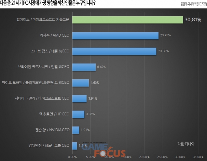가격비교 사이트 다나와가 창립 20주년을 기념하여 진행한 'PC시장 20년 최고의 이슈' 투표 이벤트에서 빌 게이츠 마이크로소프트 기술고문이 21세기 PC시장에 가장 큰 영향을 끼친 인물로 선정됐다고 밝혔다.