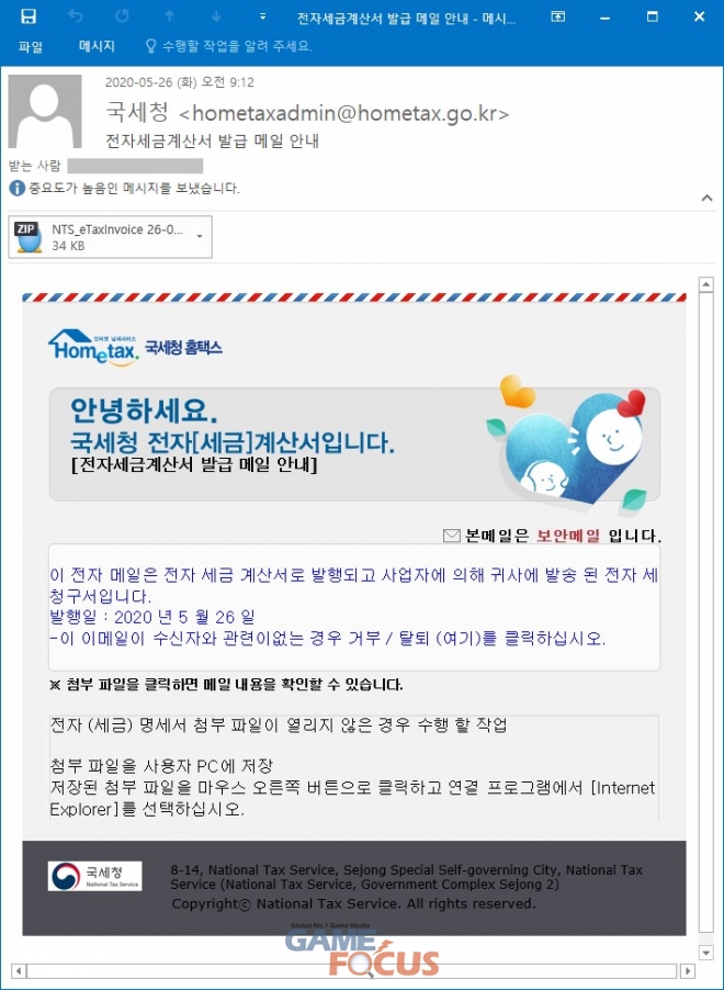 이번 공격은 악성 파일을 첨부한 이메일을 특정 대상에게 발송하는 '스피어 피싱' 이메일 공격 방식을 사용하고 있다. 특히 기존 국세청 홈택스(hometax) 사칭 공격에서 한 단계 진화해, 발신지 주소까지 실제 홈택스 도메인(hometaxadmin@hometax.go.kr)처럼 정교하게 조작한 것이 특징이다.