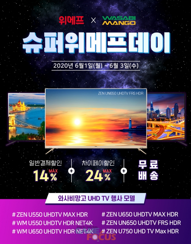 (주)와사비망고(대표이사 김환준)는 위메프에서 진행하는 '슈퍼위메프데이'에 참가하여 현재 와사비망고에서 높은 판매를 얻고 있는 6종의 TV를 최대 24% 할인하며, 추가로 무료로 배송까지 해주는 특별 이벤트를 진행한다.