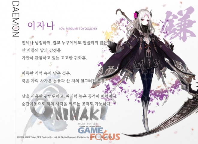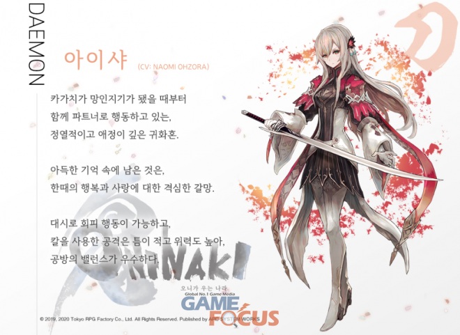 아크시스템웍스 아시아지점은 올 여름 출시 예정인 SQUARE ENIX CO., LTD.의 산하 개발 스튜디오 Tokyo RPG Factory Co., Ltd.(이하 도쿄 RPG 팩토리)에서 개발한 액션 RPG, '오니가 우는 나라'의 PlayStation4와 Nintendo Switch 한국어 번역판에 대한 게임 정보를 공개하며, 오늘부터 게임에 등장하는 주요 캐릭터와 귀화혼을 소개하는 정기 연재를 진행한다고 발표했다.