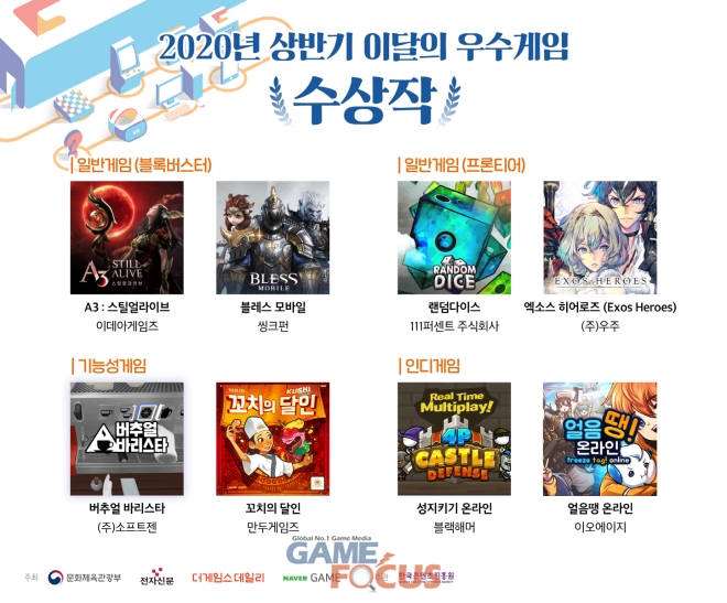 문화체육관광부(장관 박양우)와 전자신문(대표 구원모), 더게임스데일리(대표 모인), 네이버(대표 한성숙)가 주최하고, 한국콘텐츠진흥원(원장김영준, 이하 콘진원)이 주관하는 '2020년 상반기 이달의 우수게임' 선정작 8편이 7월 9일 공개되었다.