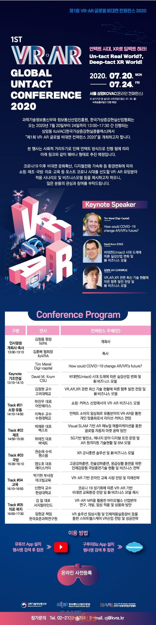 과학기술정보통신부(장관 최기영)와 정보통신산업진흥원(원장 김창용), 한국가상증강현실산업협회(회장 김훈배)가 개최하는 '제1회 VR·AR 글로벌 비대면 컨퍼런스 2020'이 비대면 웨비나(Web+Seminar)로 진행된다.