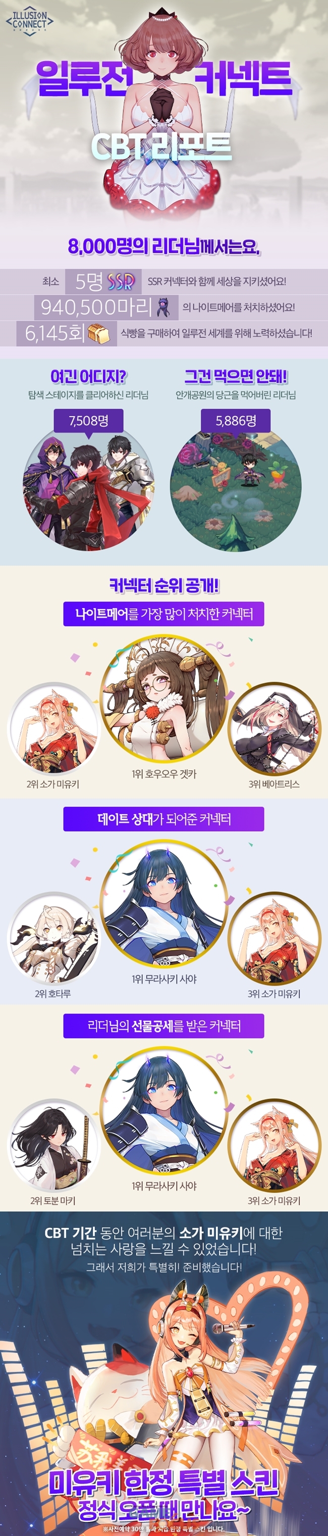 또 일루전 커넥트는 '소가 미유키' 캐릭터가 CBT 기간 동안 유저들의 사람을 가장 많이 받았다는 점을 확인하고, 그동안 베일에 둘러싸여 있던 사전예약 30만명 달성 보상인 '사전예약 한정 스킨'을 대만 서버 패키지 판매 상품이었던 소가 미유키 전용의 '네코미미 보컬로이드' 스킨으로 선정하였다.