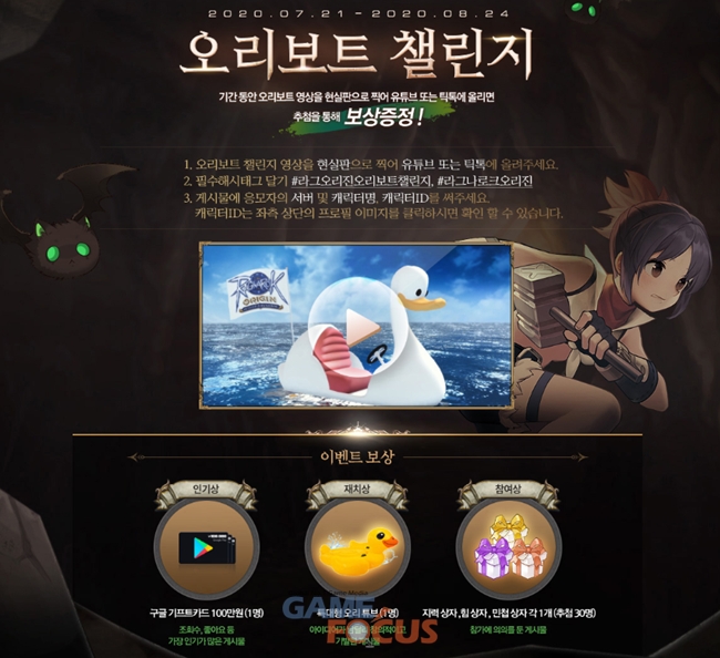 이벤트 참여자 중 가장 많은 조회수와 '좋아요'를 받은 인기상 1명에게는 '구글 기프트 카드 100만원'을, 아이디어 넘치는 영상을 만든 1명에게는 재치상으로 '특대형 오리 튜브'를 증정한다. 이외에도 참여상으로 30명을 추첨해 지력상자, 힘상자, 민첩상자를 각 1개씩 지급한다.